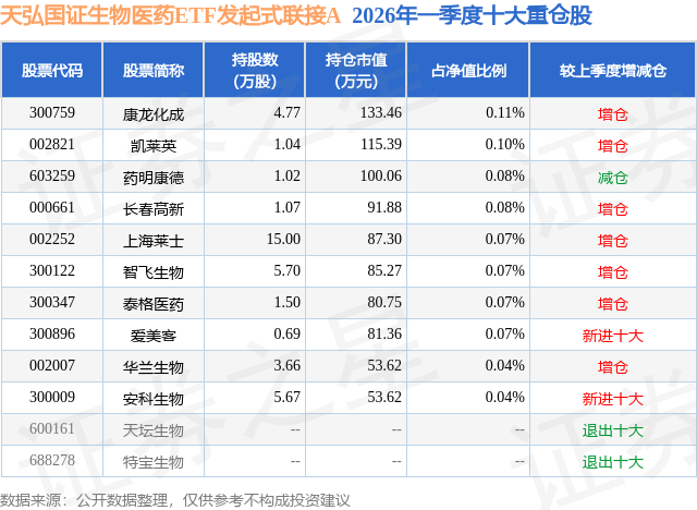从基金规模来看,天弘国证生物医药ETF发起式联接A基金2026年一季度公布的基金规模为2.6亿元,较上一期规模1.82亿元变化了7768.33万元,环比变化了42.62%。该基金最新一期资产配置为:股票占净值比0.89%,无债券类资产,现金占净值比5.33%。从基金持仓来看,该基金当季前十大股票仓位达0.73%,第一大重仓股为康龙化成(300759),持仓占比为0.11%。