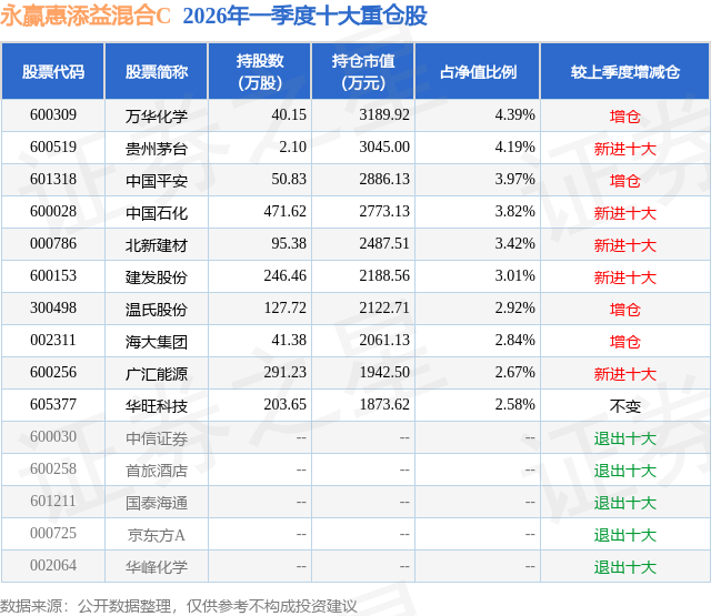 从基金规模来看,永赢惠添益混合C基金2026年一季度公布的基金规模为2.36亿元,较上一期规模2152.05万元变化了2.14亿元,环比变化了995.66%。该基金最新一期资产配置为:股票占净值比83.06%,无债券类资产,现金占净值比8.41%。从基金持仓来看,该基金当季前十大股票仓位达33.81%,第一大重仓股为万华化学(600309),持仓占比为4.39%。
