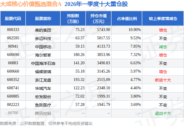 从基金规模来看,大成核心价值甄选混合A基金2026年一季度公布的基金规模为3.92亿元,较上一期规模8.13亿元变化了-4.21亿元,环比变化了-51.81%。该基金最新一期资产配置为:股票占净值比85.62%,无债券类资产,现金占净值比15.5%。从基金持仓来看,该基金当季前十大股票仓位达64.92%,第一大重仓股为美的集团(000333),持仓占比为10.9%。