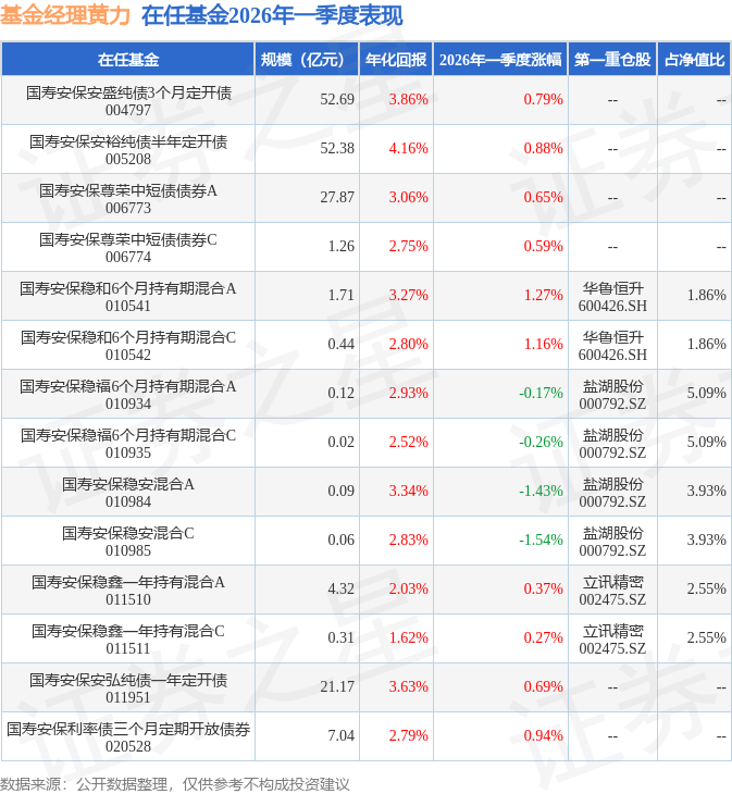 证券之星消息,日前国寿安保稳鑫一年持有混合A基金公布一季报,2026年一季度最新规模4.32亿元,季度净值涨幅为0.37%。