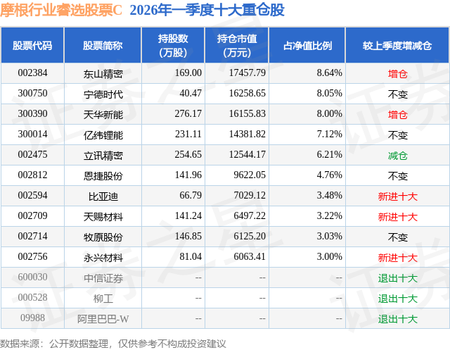 从基金规模来看,摩根行业睿选股票C基金2026年一季度公布的基金规模为4.83亿元,较上一期规模2.7亿元变化了2.12亿元,环比变化了78.58%。该基金最新一期资产配置为:股票占净值比92.11%,无债券类资产,现金占净值比8.2%。从基金持仓来看,该基金当季前十大股票仓位达55.51%,第一大重仓股为东山精密(002384),持仓占比为8.64%。