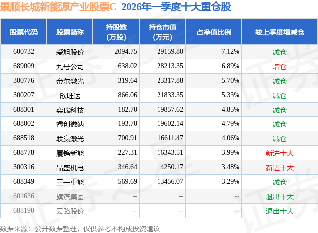 从基金规模来看,景顺长城新能源产业股票C基金2026年一季度公布的基金规模为23.33亿元,较上一期规模33.63亿元变化了-10.3亿元,环比变化了-30.63%。该基金最新一期资产配置为:股票占净值比90.21%,无债券类资产,现金占净值比10.81%。从基金持仓来看,该基金当季前十大股票仓位达49.5%,第一大重仓股为爱旭股份(600732),持仓占比为7.12%。