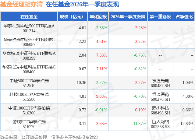 游戏ETF华泰柏瑞现任基金经理为胡亦清。其中在任基金经理胡亦清已从业1年又91天,2025年4月1日正式接手管理游戏ETF华泰柏瑞,任职期间累计回报为16.66%。目前还管理着8只基金产品(包括A类和C类),其中本季度表现最佳的基金为华泰柏瑞中证500ETF联接A(001214),季度净值涨幅为2.28%。