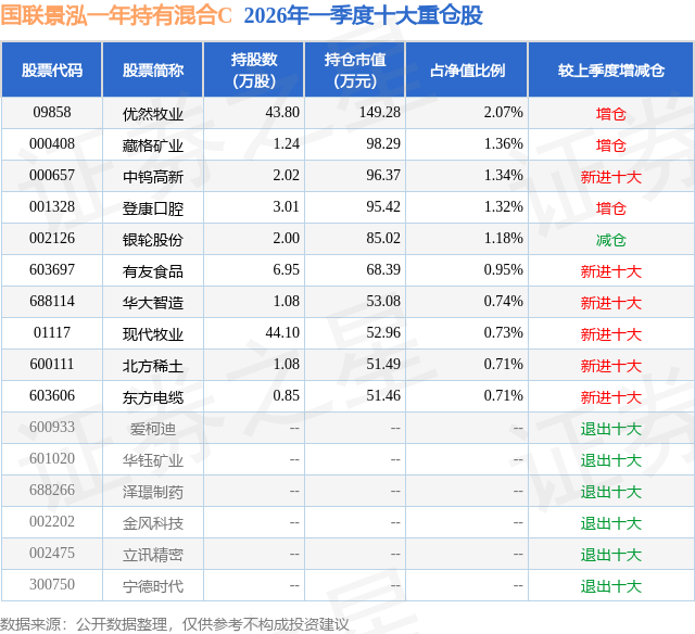 从基金规模来看,国联景泓一年持有混合C基金2026年一季度公布的基金规模为0.16亿元,较上一期规模3646.8万元变化了-2072.29万元,环比变化了-56.82%。该基金最新一期资产配置为:股票占净值比24.65%,债券占净值比100.05%,现金占净值比1.49%。从基金持仓来看,该基金当季前十大股票仓位达11.11%,第一大重仓股为优然牧业(09858),持仓占比为2.07%。
