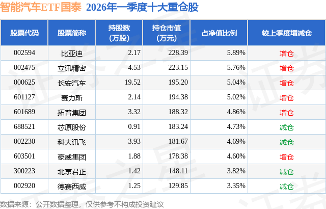 从基金规模来看,智能汽车ETF国泰基金2026年一季度公布的基金规模为0.39亿元,较上一期规模4341.12万元变化了-465.48万元,环比变化了-10.72%。该基金最新一期资产配置为:股票占净值比99.36%,无债券类资产,现金占净值比0.6%。从基金持仓来看,该基金当季前十大股票仓位达47.76%,第一大重仓股为比亚迪(002594),持仓占比为5.89%。
