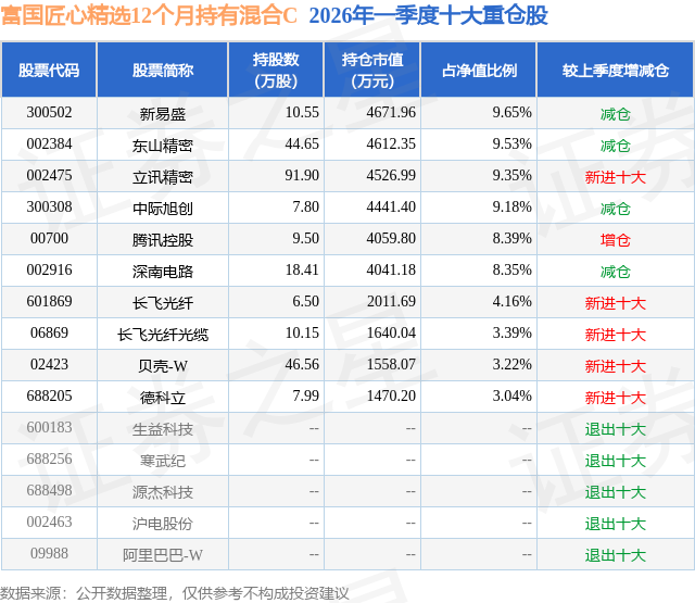 证券之星消息,日前富国匠心精选12个月持有混合C基金公布一季报,2026年一季度最新规模0.37亿元,季度净值涨幅为-2.81%。