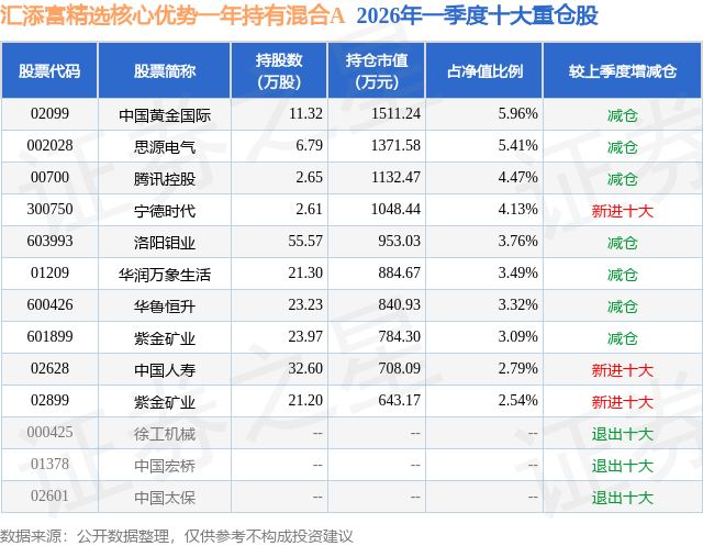 从基金规模来看,汇添富精选核心优势一年持有混合A基金2026年一季度公布的基金规模为2.43亿元,较上一期规模3.67亿元变化了-1.23亿元,环比变化了-33.61%。该基金最新一期资产配置为:股票占净值比86.46%,无债券类资产,现金占净值比9.76%。从基金持仓来看,该基金当季前十大股票仓位达38.96%,第一大重仓股为中国黄金国际(02099),持仓占比为5.96%。