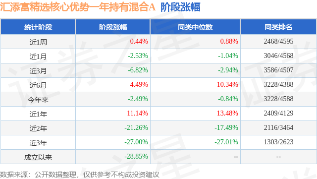 从业绩表现来看,汇添富精选核心优势一年持有混合A基金过去一年净值涨幅为38.11%,在同类基金中排名2296/4479,同类基金过去一年净值涨幅中位数为39.3%。而基金过去一年的最大回撤为-20.65%,成立以来的最大回撤为-40.25%。