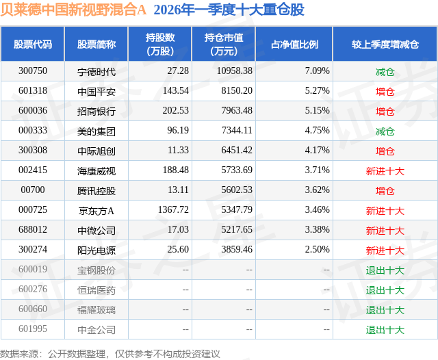 从基金规模来看,贝莱德中国新视野混合A基金2026年一季度公布的基金规模为13.42亿元,较上一期规模20.17亿元变化了-6.75亿元,环比变化了-33.49%。该基金最新一期资产配置为:股票占净值比84.13%,债券占净值比10.75%,现金占净值比5.38%。从基金持仓来看,该基金当季前十大股票仓位达43.1%,第一大重仓股为宁德时代(300750),持仓占比为7.09%。