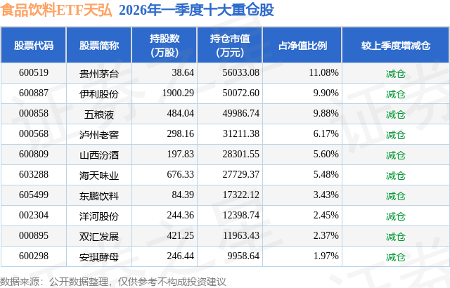从基金规模来看,食品饮料ETF天弘基金2026年一季度公布的基金规模为50.57亿元,较上一期规模54.21亿元变化了-3.64亿元,环比变化了-6.71%。该基金最新一期资产配置为:股票占净值比99.99%,无债券类资产,现金占净值比0.05%。从基金持仓来看,该基金当季前十大股票仓位达58.33%,第一大重仓股为贵州茅台(600519),持仓占比为11.08%。