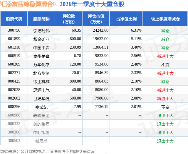 证券之星消息,日前汇添富蓝筹稳健混合E基金公布一季报,2026年一季度最新规模0.01亿元,季度净值涨幅为-3.48%。