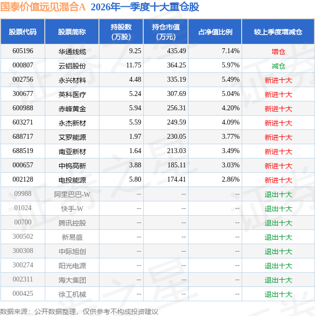 从基金规模来看,国泰价值远见混合A基金2026年一季度公布的基金规模为0.56亿元,较上一期规模1.08亿元变化了-5208.48万元,环比变化了-48.27%。该基金最新一期资产配置为:股票占净值比63.71%,债券占净值比4.95%,现金占净值比13.35%。从基金持仓来看,该基金当季前十大股票仓位达45.08%,第一大重仓股为华通线缆(605196),持仓占比为7.14%。