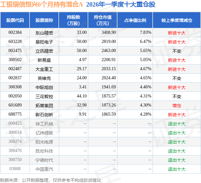 从基金规模来看,工银瑞信恒兴6个月持有混合A基金2026年一季度公布的基金规模为3.64亿元,较上一期规模5.93亿元变化了-2.29亿元,环比变化了-38.66%。该基金最新一期资产配置为:股票占净值比94.87%,无债券类资产,现金占净值比5.55%。从基金持仓来看,该基金当季前十大股票仓位达51.67%,第一大重仓股为东山精密(002384),持仓占比为7.83%。