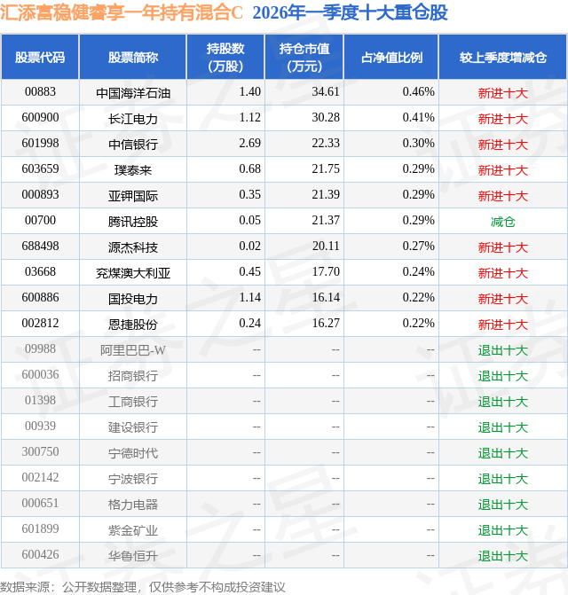从基金规模来看,汇添富稳健睿享一年持有混合C基金2026年一季度公布的基金规模为0.01亿元,较上一期规模306.76万元变化了-170.41万元,环比变化了-55.55%。该基金最新一期资产配置为:股票占净值比5.64%,债券占净值比95.56%,现金占净值比2.16%。从基金持仓来看,该基金当季前十大股票仓位达2.99%,第一大重仓股为中国海洋石油(00883),持仓占比为0.46%。