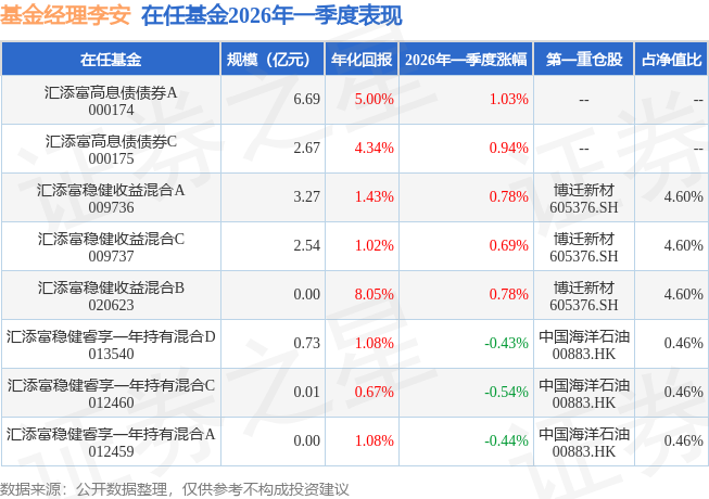 汇添富稳健睿享一年持有混合C现任基金经理为李安,本季度增聘基金经理李安,近期离任的基金经理为詹杰、丁巍。其中在任基金经理李安已从业2年又174天,2026年1月23日正式接手管理汇添富稳健睿享一年持有混合C,任职期间累计回报为0.41%。目前还管理着8只基金产品(包括A类和C类),其中本季度表现最佳的基金为汇添富高息债债券A(000174),季度净值涨幅为1.03%。