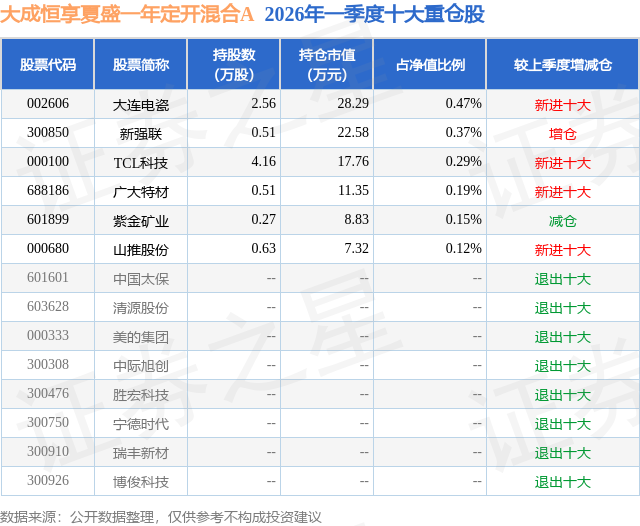 证券之星消息,日前大成恒享夏盛一年定开混合A基金公布一季报,2026年一季度最新规模0.6亿元,季度净值涨幅为0.95%。