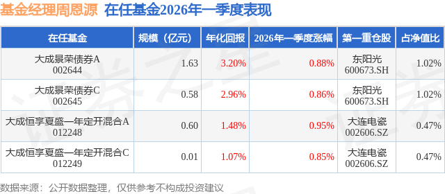大成恒享夏盛一年定开混合A现任基金经理为成琦 周恩源,本季度增聘基金经理周恩源、成琦,近期离任的基金经理为冯佳。其中在任基金经理周恩源已从业7年又31天,2025年11月7日正式接手管理大成恒享夏盛一年定开混合A,任职期间累计回报为2.05%。目前还管理着4只基金产品(包括A类和C类),其中本季度表现最佳的基金为大成恒享夏盛一年定开混合A(012248),季度净值涨幅为0.95%。
