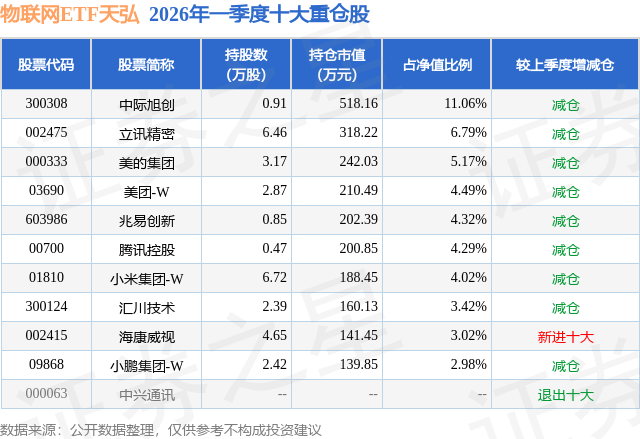 证券之星消息,日前物联网ETF天弘基金公布一季报,2026年一季度最新规模0.47亿元,季度净值涨幅为-9.19%。