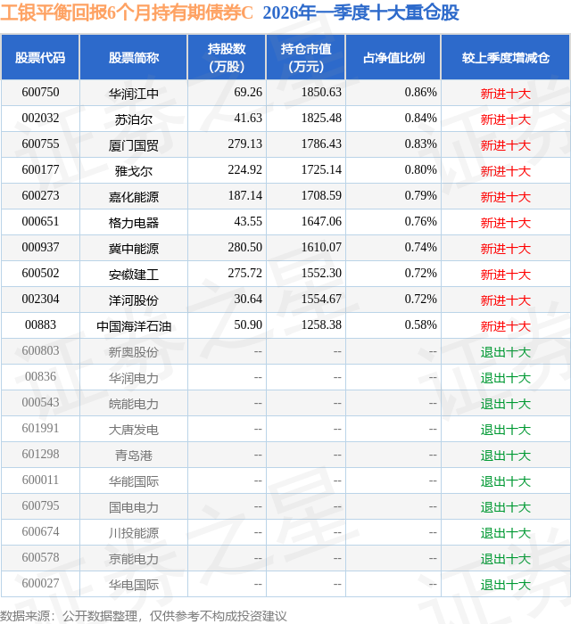 从基金规模来看,工银平衡回报6个月持有期债券C基金2026年一季度公布的基金规模为0.59亿元,较上一期规模1109.84万元变化了4834.06万元,环比变化了435.56%。该基金最新一期资产配置为:股票占净值比36.21%,债券占净值比83.85%,现金占净值比7.43%。从基金持仓来看,该基金当季前十大股票仓位达7.64%,第一大重仓股为华润江中(600750),持仓占比为0.86%。