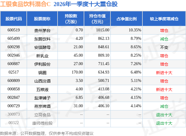从基金规模来看,工银食品饮料混合C基金2026年一季度公布的基金规模为0.52亿元,较上一期规模1887.21万元变化了3337.8万元,环比变化了176.86%。该基金最新一期资产配置为:股票占净值比94.85%,无债券类资产,现金占净值比5.54%。从基金持仓来看,该基金当季前十大股票仓位达67.39%,第一大重仓股为贵州茅台(600519),持仓占比为10.35%。