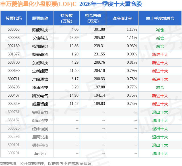 从基金规模来看,申万菱信量化小盘股票(LOF)C基金2026年一季度公布的基金规模为0.06亿元,较上一期规模2.7亿元变化了-2.64亿元,环比变化了-97.93%。该基金最新一期资产配置为:股票占净值比86.4%,债券占净值比5.92%,现金占净值比7.3%。从基金持仓来看,该基金当季前十大股票仓位达8.75%,第一大重仓股为派能科技(688063),持仓占比为1.17%。