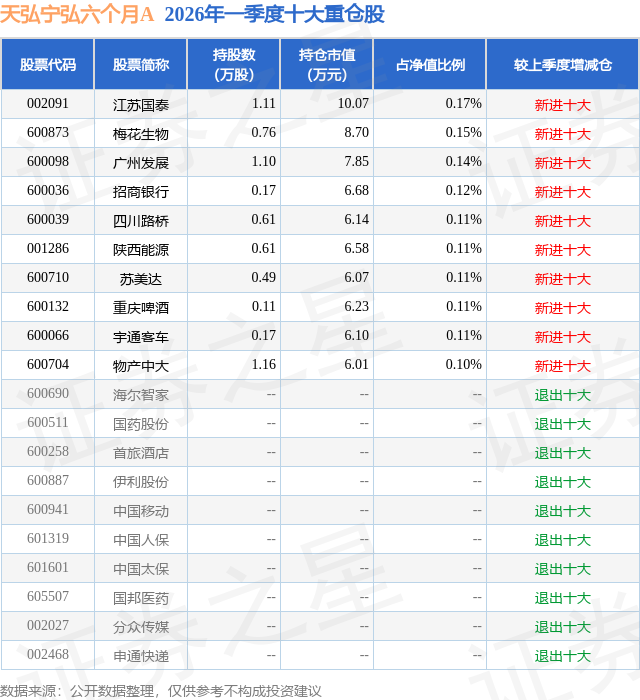 从基金规模来看,天弘宁弘六个月A基金2026年一季度公布的基金规模为0.38亿元,较上一期规模1.04亿元变化了-6643.02万元,环比变化了-63.72%。该基金最新一期资产配置为:股票占净值比9.18%,债券占净值比101.03%,现金占净值比7.6%。从基金持仓来看,该基金当季前十大股票仓位达1.23%,第一大重仓股为江苏国泰(002091),持仓占比为0.17%。