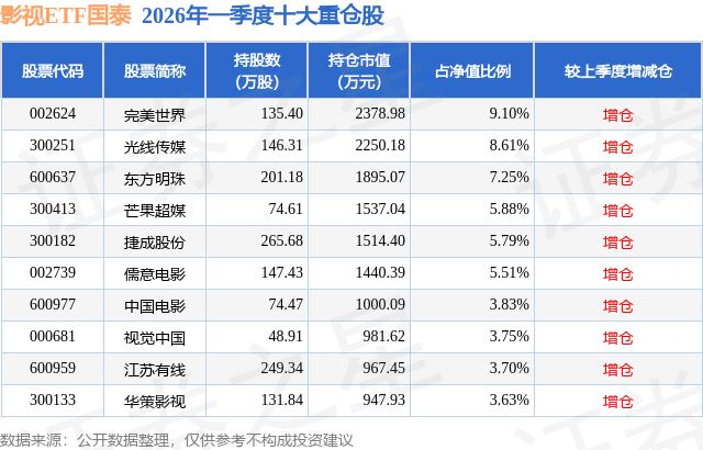 从基金规模来看,影视ETF国泰基金2026年一季度公布的基金规模为2.61亿元,较上一期规模6050.17万元变化了2.01亿元,环比变化了332.1%。该基金最新一期资产配置为:股票占净值比95.18%,无债券类资产,现金占净值比4.99%。从基金持仓来看,该基金当季前十大股票仓位达57.05%,第一大重仓股为完美世界(002624),持仓占比为9.1%。