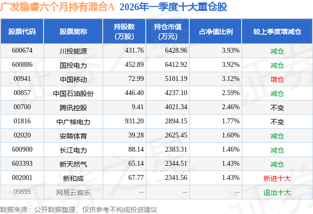 从基金规模来看,广发稳睿六个月持有混合A基金2026年一季度公布的基金规模为12.12亿元,较上一期规模6.63亿元变化了5.49亿元,环比变化了82.87%。该基金最新一期资产配置为:股票占净值比26.08%,债券占净值比104.05%,现金占净值比7.92%。从基金持仓来看,该基金当季前十大股票仓位达23.71%,第一大重仓股为川投能源(600674),持仓占比为3.93%。