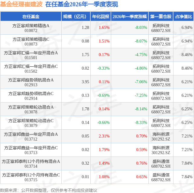 从基金规模来看,方正富邦趋势领航混合A基金2026年一季度公布的基金规模为3.95亿元,较上一期规模5.51亿元变化了-1.56亿元,环比变化了-28.33%。该基金最新一期资产配置为:股票占净值比82.65%,无债券类资产,现金占净值比17.8%。从基金持仓来看,该基金当季前十大股票仓位达32.14%,第一大重仓股为拓荆科技(688072),持仓占比为6.21%。