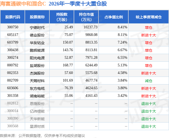 从基金规模来看,海富通碳中和混合C基金2026年一季度公布的基金规模为10.03亿元,较上一期规模2.76亿元变化了7.27亿元,环比变化了263.48%。该基金最新一期资产配置为:股票占净值比92.52%,无债券类资产,现金占净值比7.7%。从基金持仓来看,该基金当季前十大股票仓位达57.75%,第一大重仓股为宁德时代(300750),持仓占比为8.41%。