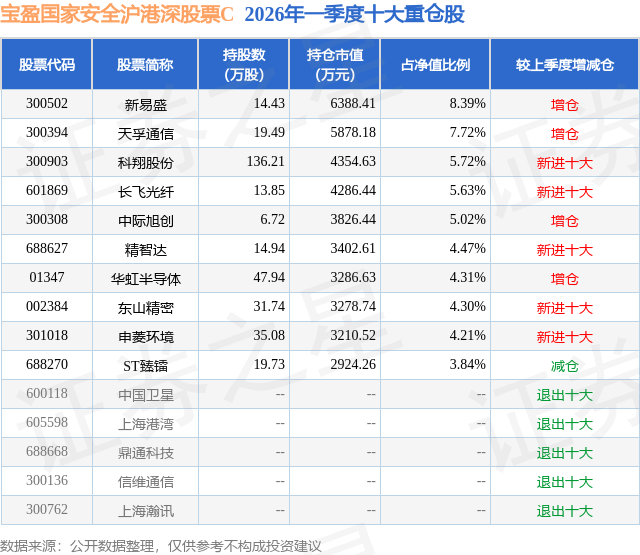 从基金规模来看,宝盈国家安全沪港深股票C基金2026年一季度公布的基金规模为2.35亿元,较上一期规模605.78万元变化了2.29亿元,环比变化了3786.87%。该基金最新一期资产配置为:股票占净值比90.41%,无债券类资产,现金占净值比7.52%。从基金持仓来看,该基金当季前十大股票仓位达53.61%,第一大重仓股为新易盛(300502),持仓占比为8.39%。