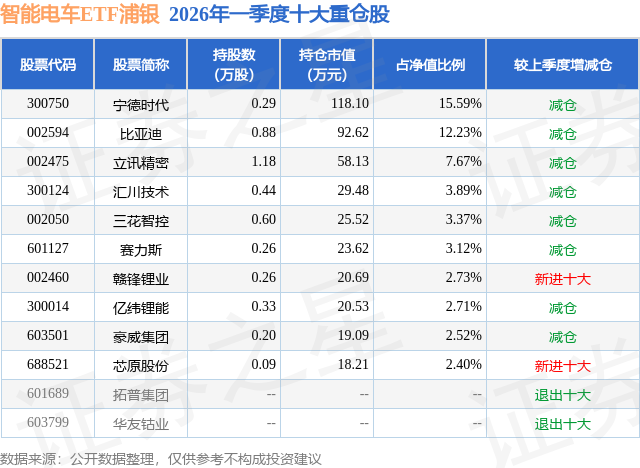 证券之星消息,日前智能电车ETF浦银基金公布一季报,2026年一季度最新规模0.08亿元,季度净值涨幅为-3.65%。