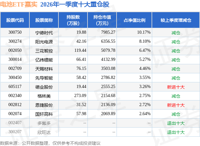 从基金规模来看,电池ETF嘉实基金2026年一季度公布的基金规模为7.85亿元,较上一期规模14.52亿元变化了-6.67亿元,环比变化了-45.95%。该基金最新一期资产配置为:股票占净值比99.3%,无债券类资产,现金占净值比0.74%。从基金持仓来看,该基金当季前十大股票仓位达49.39%,第一大重仓股为宁德时代(300750),持仓占比为10.17%。