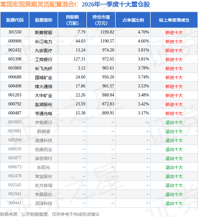 从基金规模来看,富国宏观策略灵活配置混合C基金2026年一季度公布的基金规模为0.29亿元,较上一期规模87.31万元变化了2816.84万元,环比变化了3226.25%。该基金最新一期资产配置为:股票占净值比72.16%,债券占净值比12.21%,现金占净值比15.36%。从基金持仓来看,该基金当季前十大股票仓位达38.1%,第一大重仓股为斯菱智驱(301550),持仓占比为4.7%。