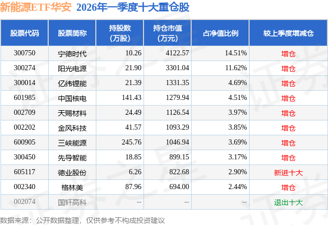 从基金规模来看,新能源ETF华安基金2026年一季度公布的基金规模为2.84亿元,较上一期规模2.54亿元变化了3048.05万元,环比变化了12.02%。该基金最新一期资产配置为:股票占净值比98.93%,无债券类资产,现金占净值比1.29%。从基金持仓来看,该基金当季前十大股票仓位达55.35%,第一大重仓股为宁德时代(300750),持仓占比为14.51%。