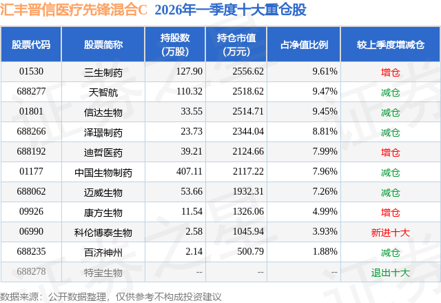 从基金规模来看,汇丰晋信医疗先锋混合C基金2026年一季度公布的基金规模为1.27亿元,较上一期规模647.36万元变化了1.21亿元,环比变化了1868.74%。该基金最新一期资产配置为:股票占净值比93.42%,无债券类资产,现金占净值比13.67%。从基金持仓来看,该基金当季前十大股票仓位达71.35%,第一大重仓股为三生制药(01530),持仓占比为9.61%。