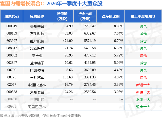 从基金规模来看,富国内需增长混合C基金2026年一季度公布的基金规模为0.15亿元,较上一期规模2803.74万元变化了-1318.33万元,环比变化了-47.02%。该基金最新一期资产配置为:股票占净值比91.61%,无债券类资产,现金占净值比9.24%。从基金持仓来看,该基金当季前十大股票仓位达55.25%,第一大重仓股为贵州茅台(600519),持仓占比为8.69%。