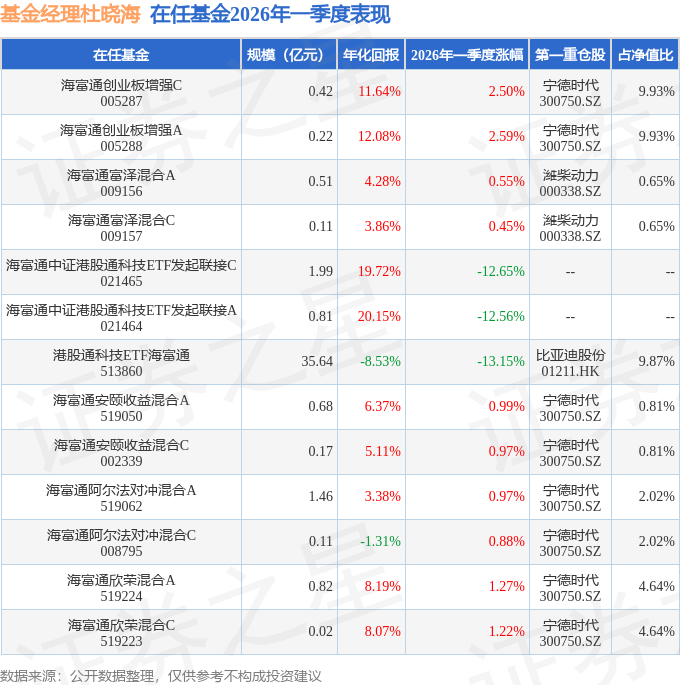 证券之星消息,日前港股通科技ETF海富通基金公布一季报,2026年一季度最新规模35.64亿元,季度净值涨幅为-13.15%。