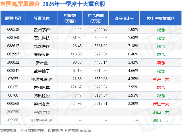 从基金规模来看,富国高质量混合基金2026年一季度公布的基金规模为8.17亿元,较上一期规模12.73亿元变化了-4.56亿元,环比变化了-35.83%。该基金最新一期资产配置为:股票占净值比91.57%,无债券类资产,现金占净值比9.07%。从基金持仓来看,该基金当季前十大股票仓位达54.66%,第一大重仓股为贵州茅台(600519),持仓占比为7.89%。