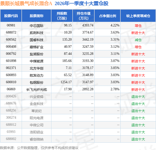 从基金规模来看,景顺长城景气成长混合A基金2026年一季度公布的基金规模为7.67亿元,较上一期规模11.08亿元变化了-3.41亿元,环比变化了-30.8%。该基金最新一期资产配置为:股票占净值比82.06%,债券占净值比4.89%,现金占净值比5.55%。从基金持仓来看,该基金当季前十大股票仓位达32.35%,第一大重仓股为中芯国际(00981),持仓占比为4.22%。
