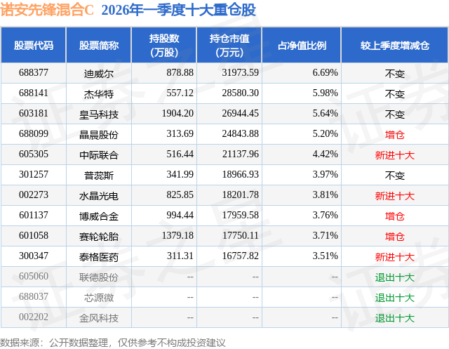 证券之星消息,日前诺安先锋混合C基金公布一季报,2026年一季度最新规模8.62亿元,季度净值涨幅为1.74%。