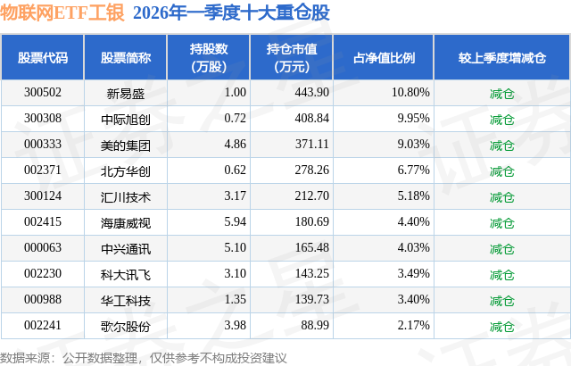 从基金规模来看,物联网ETF工银基金2026年一季度公布的基金规模为0.41亿元,较上一期规模4765.48万元变化了-656.41万元,环比变化了-13.77%。该基金最新一期资产配置为:股票占净值比98.96%,无债券类资产,现金占净值比0.91%。从基金持仓来看,该基金当季前十大股票仓位达59.22%,第一大重仓股为新易盛(300502),持仓占比为10.8%。