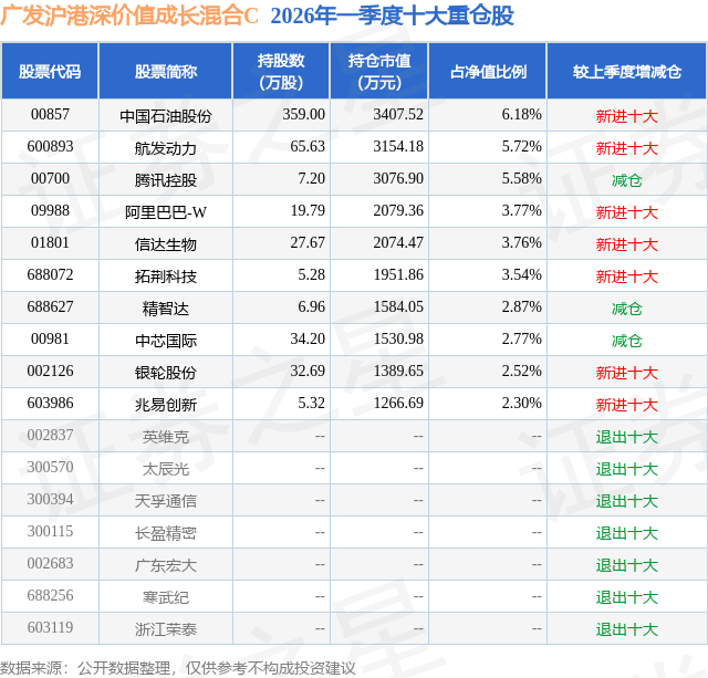 从基金规模来看,广发沪港深价值成长混合C基金2026年一季度公布的基金规模为0.23亿元,较上一期规模3.94亿元变化了-3.72亿元,环比变化了-94.19%。该基金最新一期资产配置为:股票占净值比81.03%,债券占净值比0.8%,现金占净值比12.21%。从基金持仓来看,该基金当季前十大股票仓位达39.01%,第一大重仓股为中国石油股份(00857),持仓占比为6.18%。