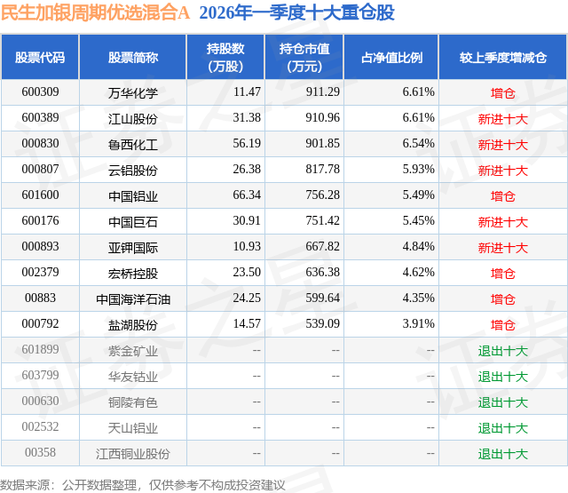 从基金规模来看,民生加银周期优选混合A基金2026年一季度公布的基金规模为0.35亿元,较上一期规模2708.51万元变化了832.27万元,环比变化了30.73%。该基金最新一期资产配置为:股票占净值比90.54%,无债券类资产,现金占净值比6.69%。从基金持仓来看,该基金当季前十大股票仓位达54.35%,第一大重仓股为万华化学(600309),持仓占比为6.61%。