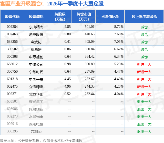 从基金规模来看,富国产业升级混合C基金2026年一季度公布的基金规模为0.04亿元,较上一期规模56.68万元变化了363.59万元,环比变化了641.52%。该基金最新一期资产配置为:股票占净值比92.66%,债券占净值比0.53%,现金占净值比7.95%。从基金持仓来看,该基金当季前十大股票仓位达58.78%,第一大重仓股为东山精密(002384),持仓占比为8.72%。