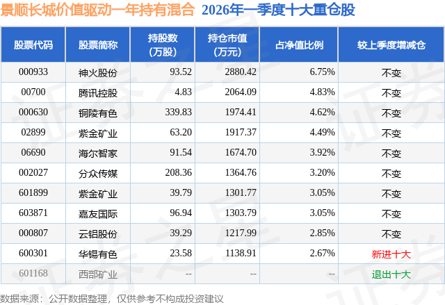 从基金规模来看,景顺长城价值驱动一年持有混合基金2026年一季度公布的基金规模为4.27亿元,较上一期规模3.78亿元变化了4856.23万元,环比变化了12.83%。该基金最新一期资产配置为:股票占净值比67.76%,无债券类资产,现金占净值比32.58%。从基金持仓来看,该基金当季前十大股票仓位达39.43%,第一大重仓股为神火股份(000933),持仓占比为6.75%。