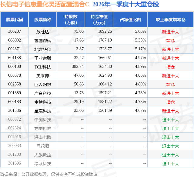 从基金规模来看,长信电子信息量化灵活配置混合C基金2026年一季度公布的基金规模为1.83亿元,较上一期规模299.29万元变化了1.8亿元,环比变化了6001.33%。该基金最新一期资产配置为:股票占净值比93.61%,无债券类资产,现金占净值比7.87%。从基金持仓来看,该基金当季前十大股票仓位达49.88%,第一大重仓股为欣旺达(300207),持仓占比为5.66%。