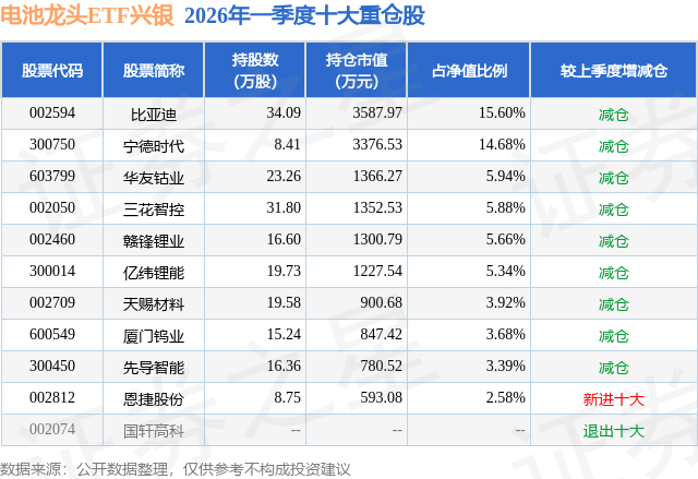 证券之星消息,日前电池龙头ETF兴银基金公布一季报,2026年一季度最新规模2.3亿元,季度净值涨幅为1.38%。