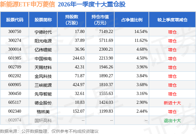 从基金规模来看,新能源ETF申万菱信基金2026年一季度公布的基金规模为4.92亿元,较上一期规模4.33亿元变化了5842.78万元,环比变化了13.49%。该基金最新一期资产配置为:股票占净值比99.02%,无债券类资产,现金占净值比1.0%。从基金持仓来看,该基金当季前十大股票仓位达55.32%,第一大重仓股为宁德时代(300750),持仓占比为14.54%。