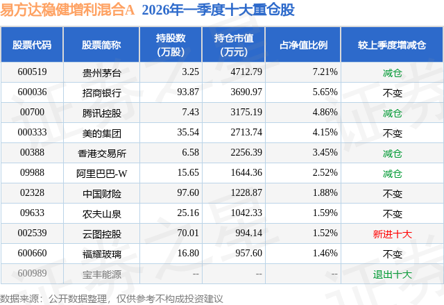 从基金规模来看,易方达稳健增利混合A基金2026年一季度公布的基金规模为6.19亿元,较上一期规模8.35亿元变化了-2.17亿元,环比变化了-25.93%。该基金最新一期资产配置为:股票占净值比44.22%,债券占净值比53.22%,现金占净值比3.13%。从基金持仓来看,该基金当季前十大股票仓位达34.29%,第一大重仓股为贵州茅台(600519),持仓占比为7.21%。